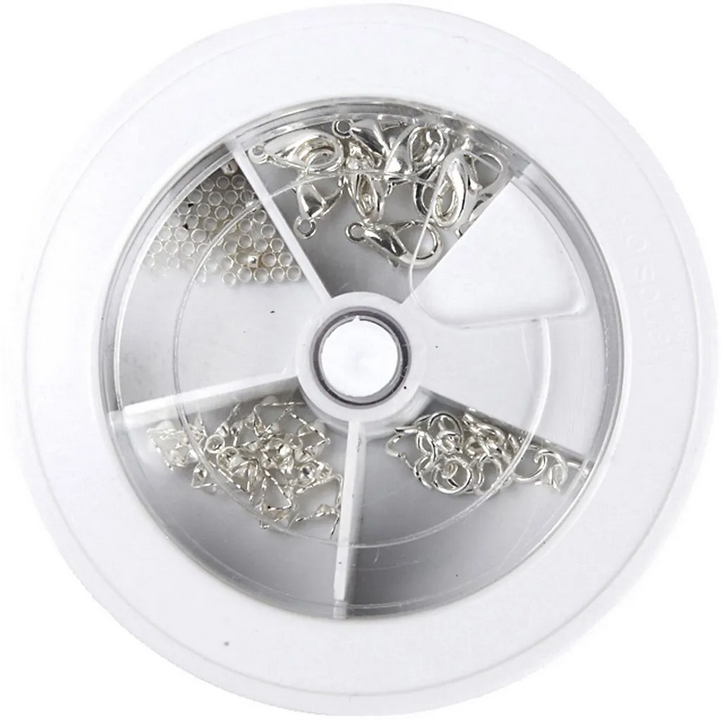 Hvis du vil lage dine egne smykker, er dette settet en strålende idé. Du kan lage halskjeder, armbånd og øreringer – og feste alt perfekt på dem – fordi settet har alt du trenger. Du kan klippe tråden til nøyaktig den lengden du ønsker med smykkeklyper – og de små krympeperlene kan festes med en universaltang. Du kan klemme knutedekslene rundt tråden – og du kan f.eks. bruke de runde ringene med åpning til å feste hummerklemmen og maljen på knutedekselet..