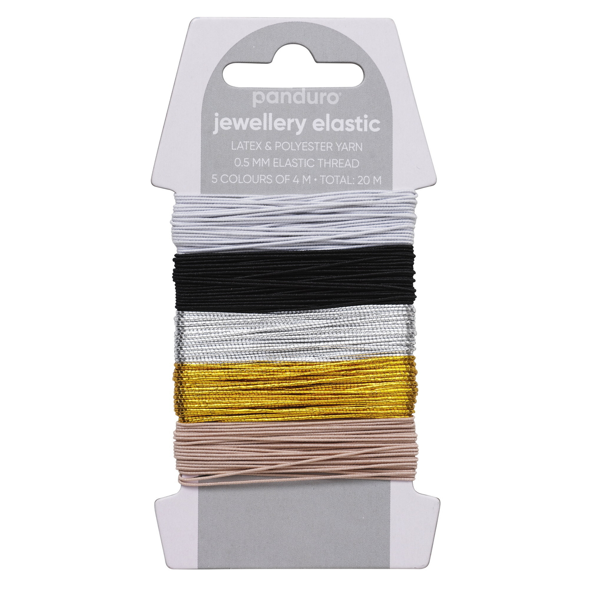 Jewellery elastic thread soft mix er 5 tekstilbelagte elastiske smykketråder à 4 meter i vanlige farger samt to glinsende metallicfarger som blir en kjempefin basis for fargerike perler. Liker du å lage smykker, vet du hvor viktig det er med en god tråd som er fast og slitesterk, men likevel elastisk. Tråden er tynn – bare 0,5 mm tykk, noe som gjør den velegnet også for veldig små perler – og vi i Panduro vet at dere er glade i slike! Tråden er fremstilt i lateks og polyester.