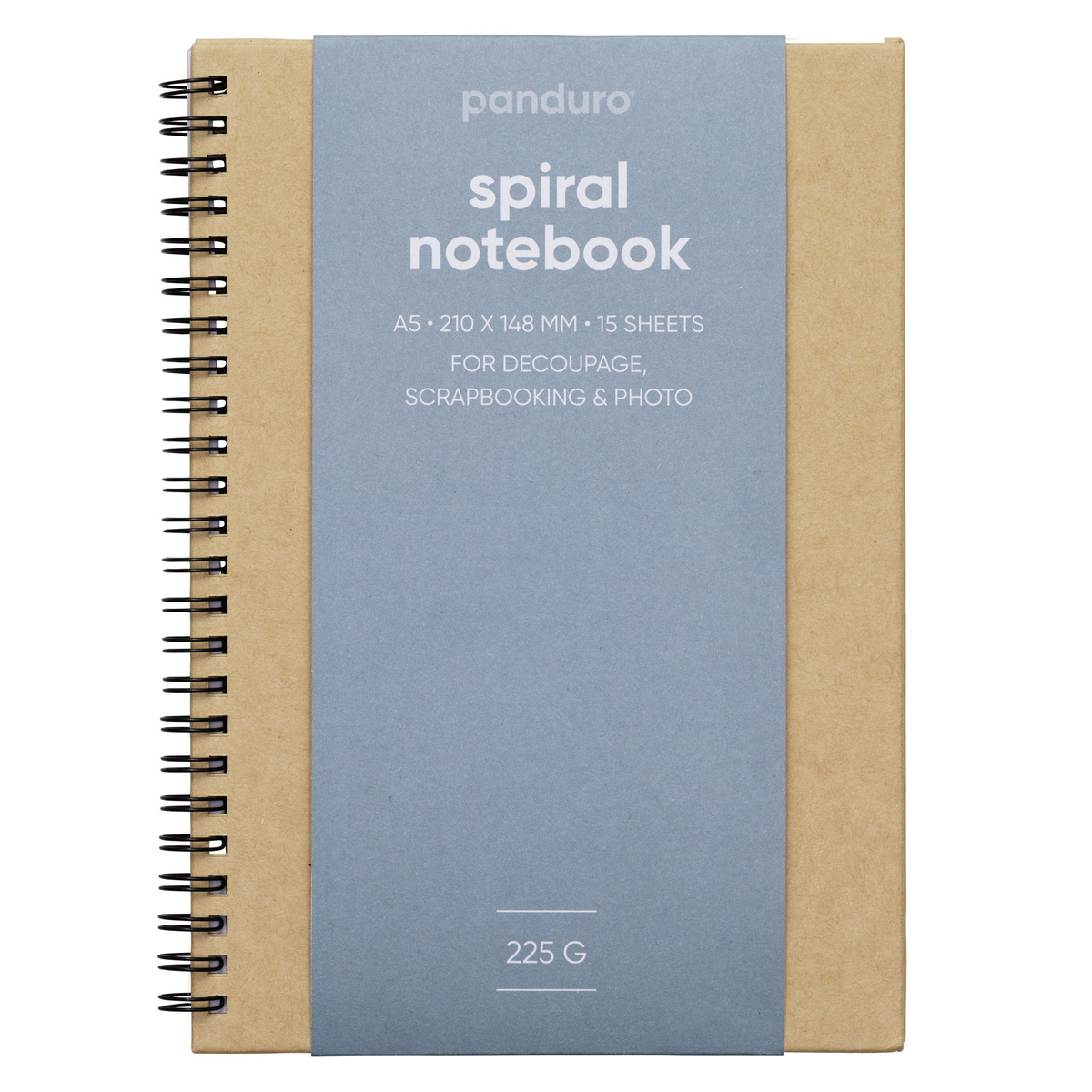 Spiral Notebook i A5-format (148x210 mm). Denne notatboken /albumet med spiralrygg er litt mer enn hva det ser ut som. Omslaget er fremstilt i hard, naturfarget kartong, og på innsiden har boken 15 ubehandlede hvite ark med vekt 225 gram. Den høye papirvekten gjør at arkene egner seg godt til decoupage, scrapbooking, fotografier og andre aktiviteter som krever skikkelige ark.