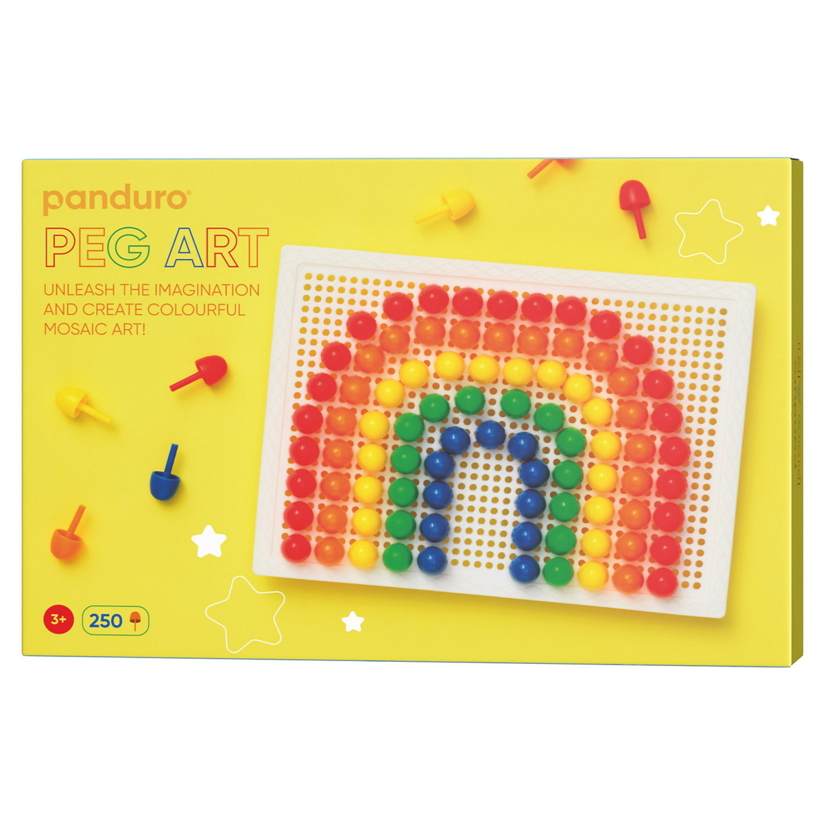Et flott sett med 250 stiftperler og en 19×13,5 cm stor perleplate. Panduros store og fargerike stiftperler er lette og morsomme å lære med. De perlelignende mosaikk-dråpene er litt spesielle i formen: den Ø13 mm store «perlen» består av en rund dråpe på en stift som er 16 mm lang, og hele stiftperlens lengde er 27 mm. Pakken inneholder 350 perler i 7 ulike farger og 1 perleplate. Fra 3 år.