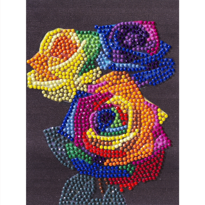 Panduro Diamond Painting er litt maling etter tall, litt perling, litt hobbyprosjekt og mye presisjon! Motivet er tre regnbuefargede roser på en 12x16 cm stor fortrykt vev med tall. Dessuten følger det med applikator, silikon, skål og flere poser med små, fargede halvkuler / «diamanter» av plast med diameter ca. 2 mm. Velg en farge, fyll skålen, dra av beskyttelsesplasten og så er det bare å begynne å male. Trenger du å ta en pause? Husk å sette plasten på plass igjen, slik at limet holder seg klebrig.