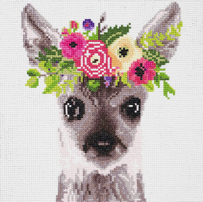 Panduro Diamond Painting er litt maling etter tall, litt perling, litt hobbyprosjekt og mye presisjon! Motivet i settet er et reinsdyr med blomster på en 30×30 cm stor forhåndstrykt vev med tall. Dessuten følger det med applikator, silikon, skål og flere poser med små, fargede halvkuler / «diamanter» av plast med diameter ca. 2 mm. Velg en farge, fyll skålen, dra av beskyttelsesplasten og så er det bare å begynne å male. Trenger du en pause, må du huske å sette på plasten igjen.
