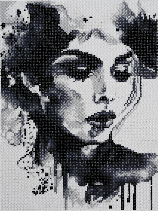 Panduro Diamond Painting er litt maling etter tall, litt perling, litt hobbyprosjekt og mye presisjon! Kunstformen kalles også diamantmaling og diamond art. Motivet i kitet er spennende ansikter i svart og hvitt som minner om akvarell- eller blekkmaling. Motivet er trykt på en 30×40 cm stor vev med tall. Dessuten følger det med applikator, silikon, skål og flere poser med små, fargede halvkuler / «diamanter» av plast med diameter ca. 2 mm. Velg en farge, fyll skålen, dra av beskyttelsesplasten og så er det bare å begynne å male. Trenger du en pause, må du huske å sette på plasten igjen.