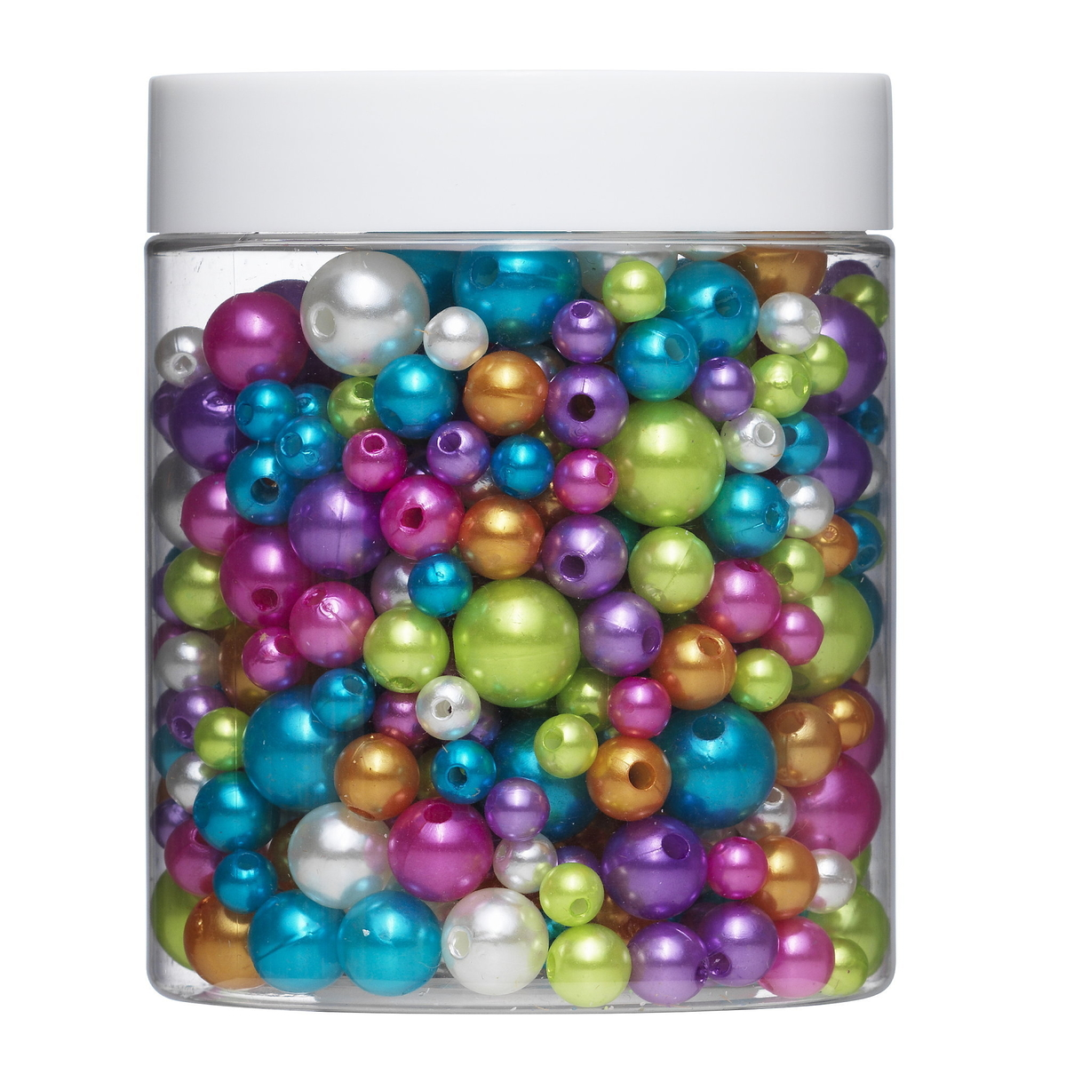 Round Shiny Beads – en stor boks med ca. 680 runde, perlemorglinsende perler i 4 forskjellige størrelser og 6 forskjellige farger! Med denne boksen og tilstrekkelig mye smykketråd blir det veldig mange armbånd eller halskjeder – eller ett veeeeldig langt. Du perler, du bestemmer! Boksen inneholder perler som er 6, 8, 10 og 12 mm i diameter. Hulldiameter 1,5–2 mm. Laget av plast. Fra 3 år.