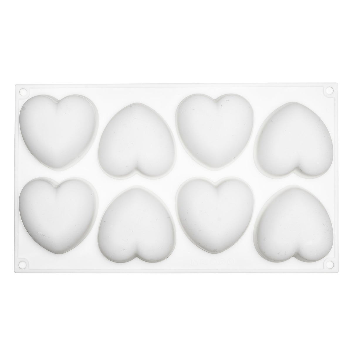 Silikonform med 8 store og runde hjerter med slett innoverbuet bunn. Alt du støper i denne formen vil signalisere kjærlighet, det er helt sikkert. Dekorasjoner til valentinsdagen, små kaker eller håndmalte hjerter til en spesiell person – mulighetene bestemmes av størrelsen på ditt eget hjerte. Formen er 29×16,9×3,5 cm, og hvert hjerte blir 7×7×3,5 cm (litt mindre nederst). Formen er beregnet for stearin, såpe, gips, betong, resin eller sjokolade / kakerøre.