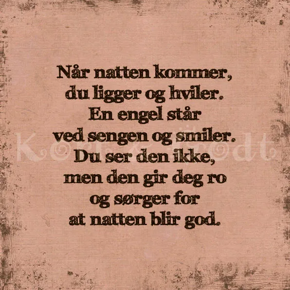 "Metallskilt med norske tekster. Når natten kommer, du ligger og hviler. En engel står ved sengen og smiler. Du ser den ikke, men den gir deg ro og sørger for at natten blir god."