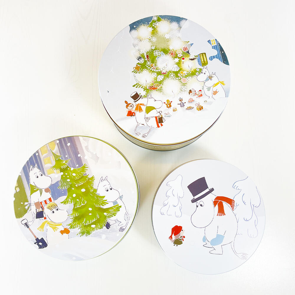 Dekorative og søte Mummi kakebokser med vinter og julemotiv. Boksene er i tinn fra vår egenproduserte kolleksjon. Boksene er fine til knekkebrød, kaker, småsaker – eller hva du måtte ønske. Fine hjemme og supre til å gi bort i gave. Med eller uten noe i. Håndvask og grundig tørking anbefales.