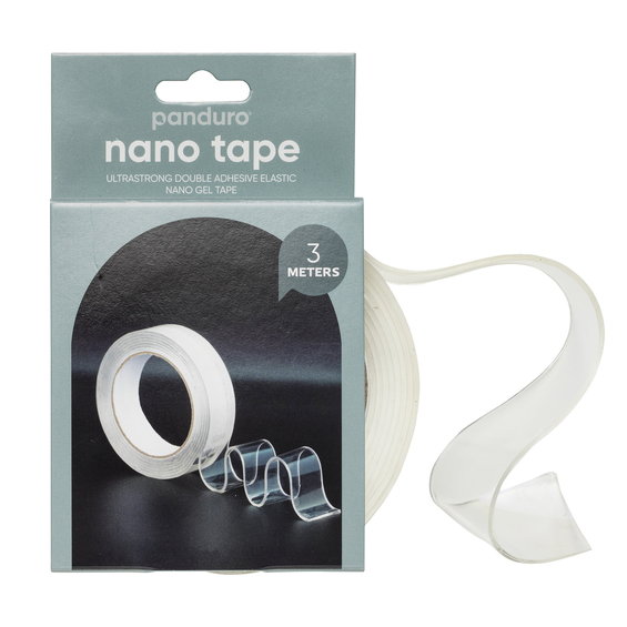 Nano Tape er en transparent, tykk og dobbeltsidig kraftig nanotape som gjør det enkelt å feste / tape fast ting på vegger, samle ledninger under skrivebord eller stoppe tepper som liker å gli rundt. Rullen inneholder 3 meter tape som er 3 cm bred. Nano Tape har mange kreative og praktiske bruksområder, og den blir gjerne uunnværlig når man først har prøvd den! Det er imidlertid ikke mulig å spesifisere nøyaktig bærekraft eller lignende, siden alt avhenger av hva du vil feste og på hvilket materiale du vil gjøre det. En tommelfingerregel er imidlertid å ikke bruke den på malt vegg, tapet eller stoff, siden den er så kraftig at den med all sannsynlighet vil ta med seg litt av underlaget hvis / når du vil fjerne eller flytte på den.