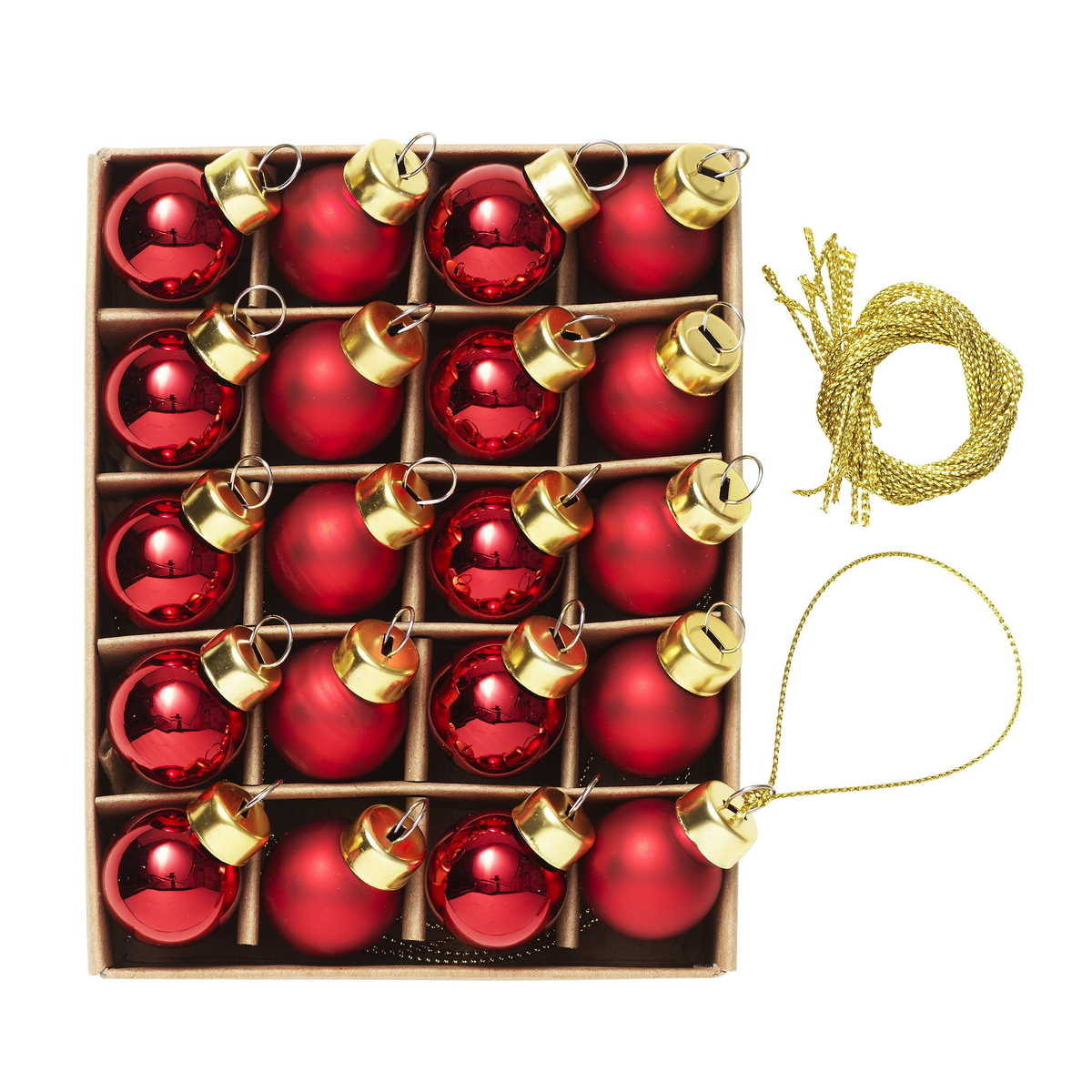 Pakken inneholder 20 julekuler, 10 blanke og 10 matte. Hatten på julekulene er laget av metall med løkke til oppheng. Tvinnet gullsnor følger med i pakken.