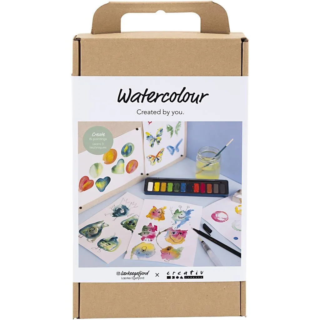 Med vårt Creativity in a Box-sett kan barna lære om de morsomme egenskapene til vannfarger og bli vant til å bruke denne typen maling. Skapt i samarbeid med lege, forfatter og kunstner Lærke Egefjord. Inneholder alle materialene og instruksjonene dere trenger.