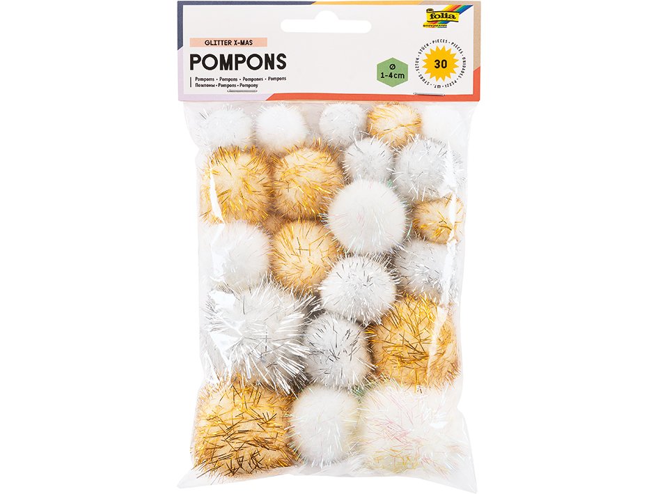 POMPONGER SETT M/GLITTER - HVIT, sølv, gull - 30ASS.
