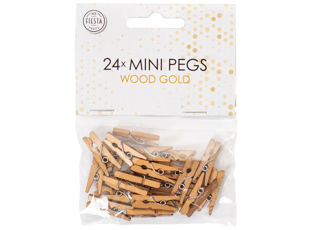 Dekorative små klesklyper, perfekte som dekorasjon eller til å lage små, søte girlandere/snorer der man kan henge opp bilder, tegninger og andre ting som ikke veier så mye. Klesklypene er 25 mm lange og 3 mm brede. Pakken inneholder 24 stk. Laget av tre. Gull.