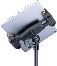 Gulvstativ med holder for nettbrett eller smarttelefon.