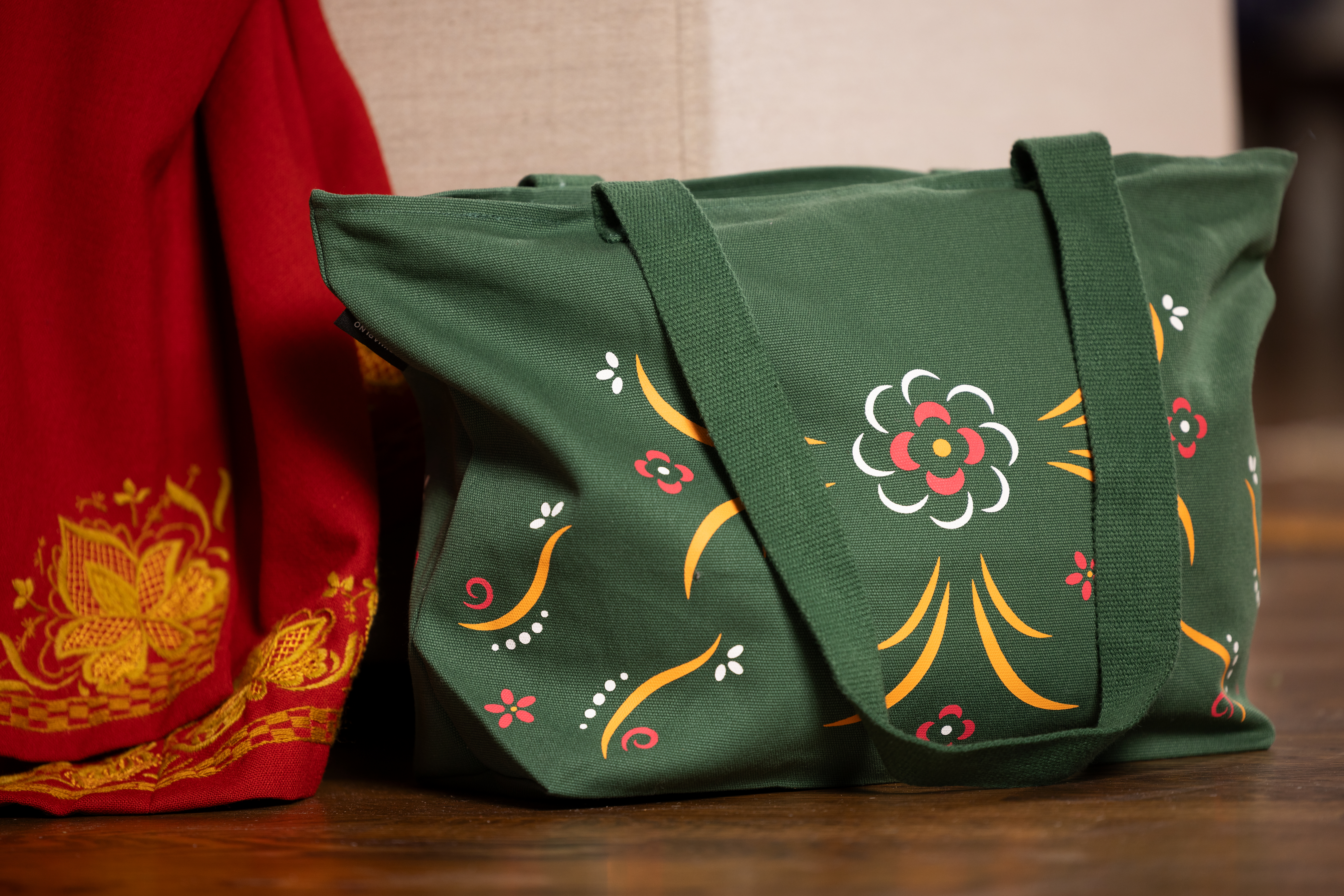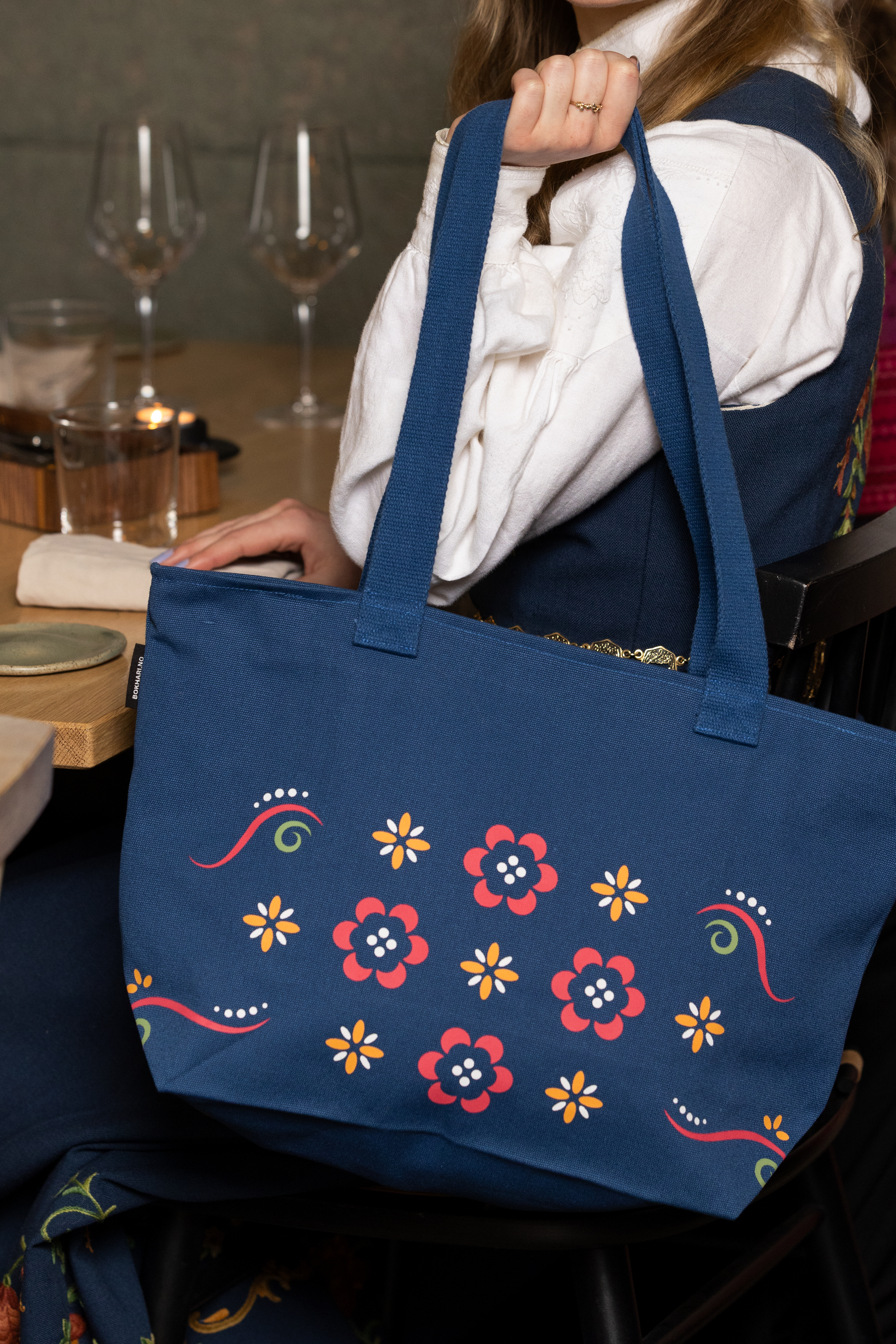 Med mønstre hentet fra norsk bunadstradisjon og funksjoner tilpasset måten vi feirer på i dag, forener den arv og bruk. Med respekt for det du bærer – og plass til det du trenger.