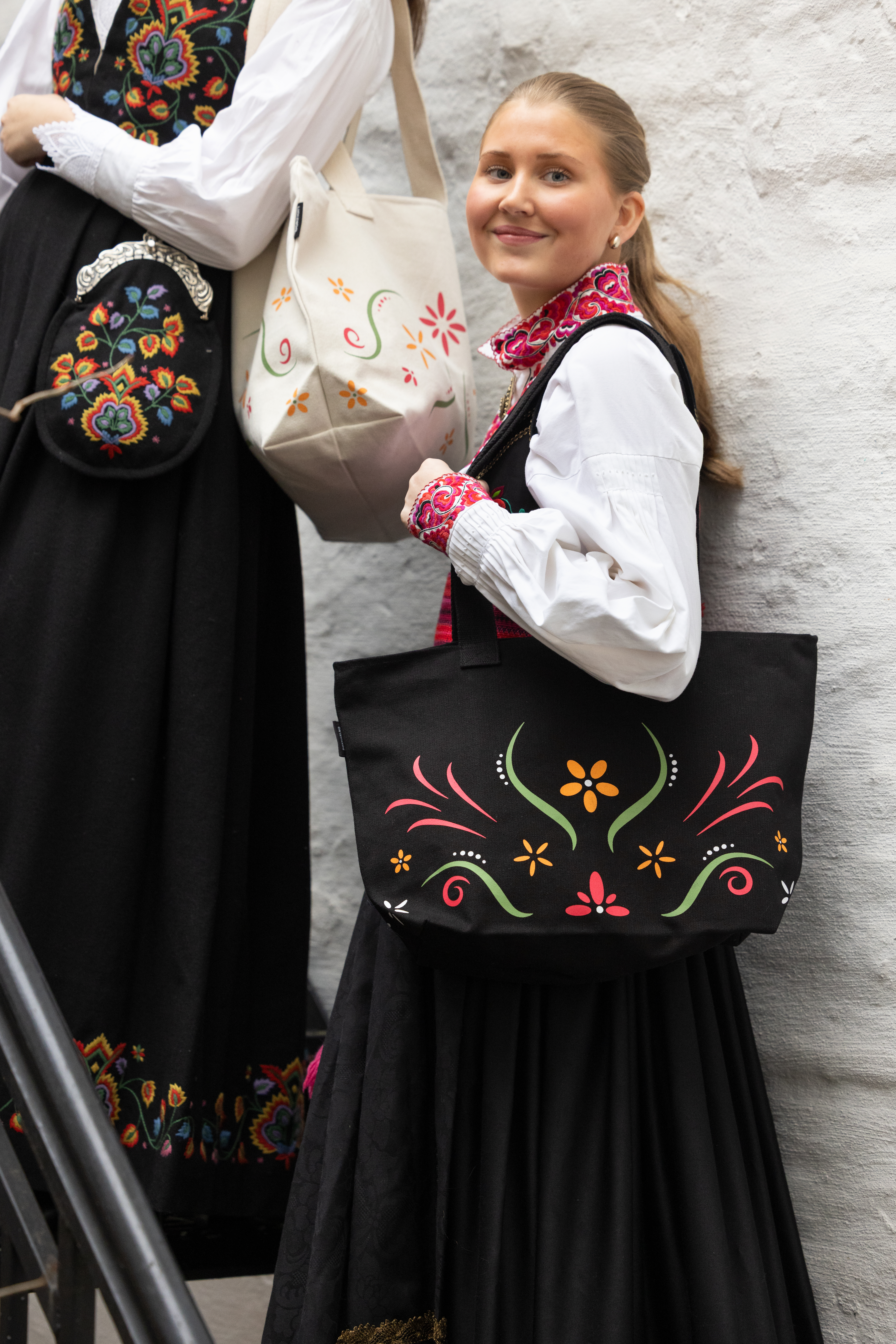Veska kommer i sort, blå, grønn, rød og hvit – hentet fra de mest brukte bunadsfargene. Den har innerlomme, flaggfeste og nøkkelhempe, og nasjonalsangen er trykket på innsiden som en liten jukselapp, om du skulle trenge den.