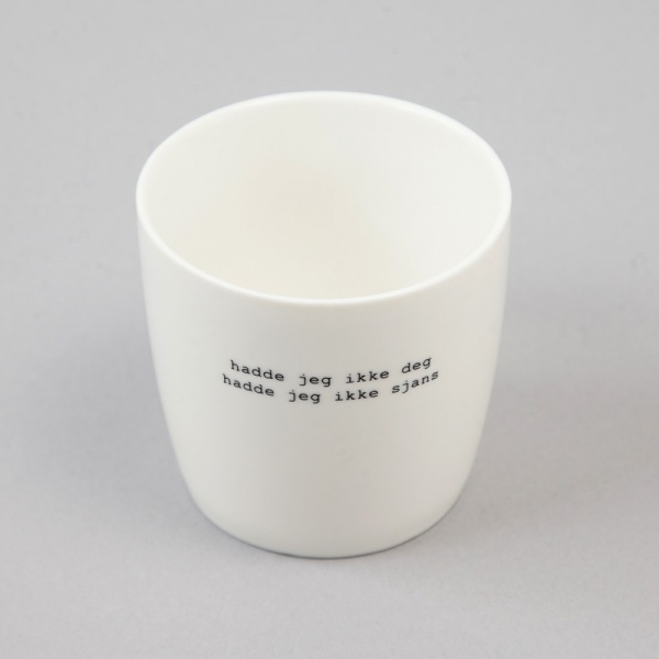 Bestselger! Nydelige porselenskrus med tekster av Trygve Skaug. Tåler oppvaskmaskin. Mål H 9cm, Ø 9cm.