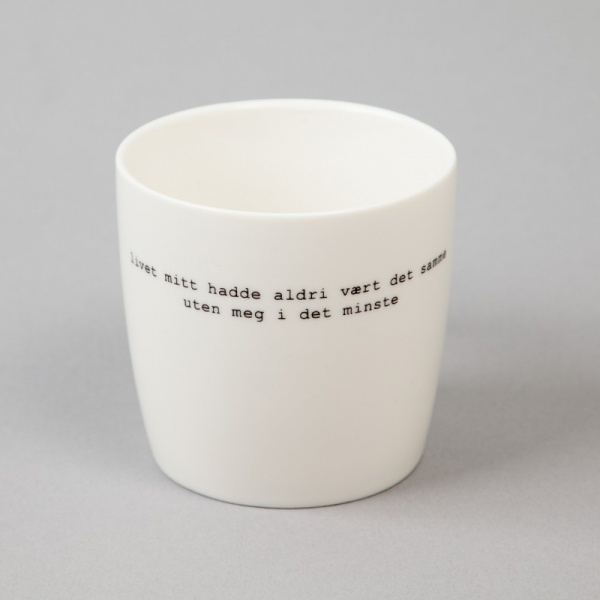 Bestselger! Nydelige porselenskrus med tekster av Trygve Skaug. Tåler oppvaskmaskin. Mål H 9cm, Ø 9cm.