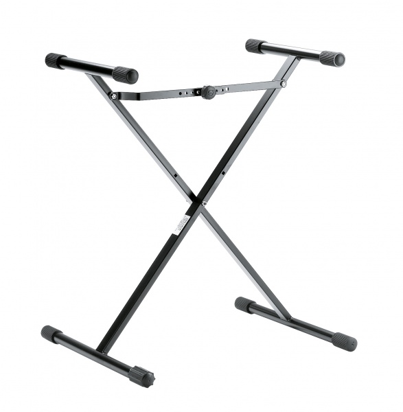 X-style keyboard stand, especially designed for children. Very low height-adjustable and easy to set up and fold. Unique adjustment mechanism insures the stand to open always to the desired height and width. Slidable non-marring pads on the support arms provide a firm fit also for smaller keyboards.