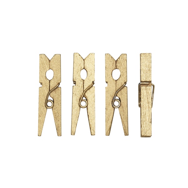 Dekorative små klesklyper, perfekte som dekorasjon eller til å lage små, søte girlandere/snorer der man kan henge opp bilder, tegninger og andre ting som ikke veier så mye. Klesklypene er 30 mm lange og 4 mm brede. Pakken inneholder 48 stk. Laget av tre. Gullfargede.