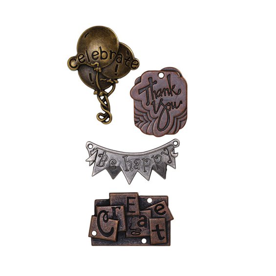 Charms metallmiks, små dekorative utsmykninger til din Art Journal, kortlaging eller lignenede. Ord, 4 stk. 46x23 - 35x48 mm. Celebrate, Thank You, Be happy & Create.
