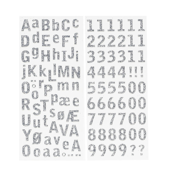 Stickers alfabet/tall, av papir med glitter (A-Å skandinavisk), høyde: A=14 mm. Syre- og ligninfritt. 4 ark 7,5x17 cm, 232 stk. Sølv
