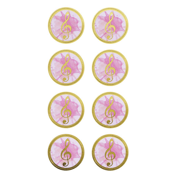Stickers konfirmasjon, av papir, 1 ark 71x130 mm. Dekorer innbydelseskort, bordkort o.l. 16 stk. Musikk rosa Gullfoil