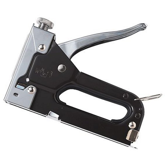 Stiftepistol, i kraftig kvalitet med justerbart anslag, 15,5x10,5 cm. Sørg for at den gjengede metallskruen strammes før bruk. Stifter 4-14 mm. Stifter se art. nr. 512656.