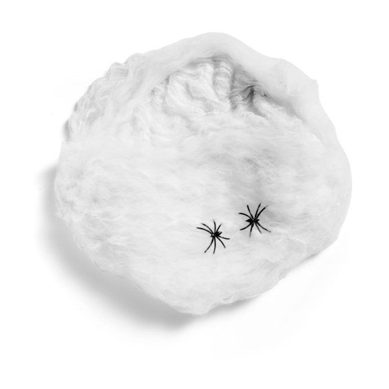 Spindelvev, med 2 edderkopper av plast. Dekor til Halloween o.l. Pakke med 40 g.