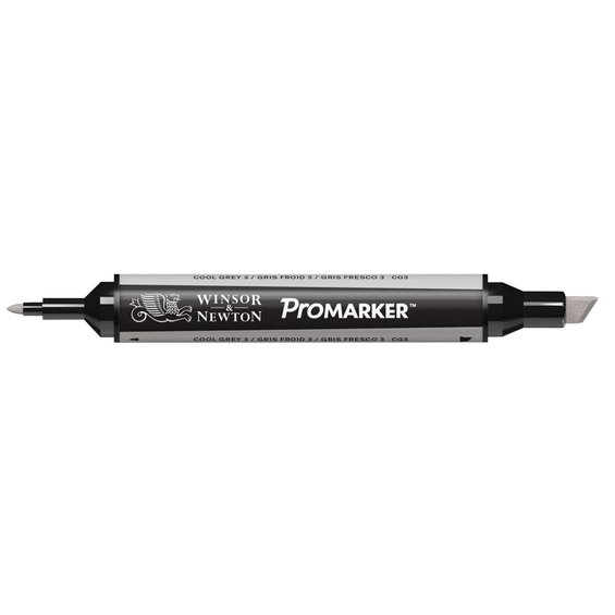 Promarker twin-tip. Professional twin-tip marker. Tusj med to ulike spisser - til detaljarbeider og til fargelegging. Permanent. Egnet til alle områder innen kunst, design og hobby. De brukes like gjerne av arkitekter, serietegnere og mange illustratører som av nybegynnere. De er også meget gode til scrapbooking og til stempelmotiver. En utmerket egenskap er at fargeleggingen blir helt jevn også på store flater. En annen egenskap er at de er transparente, noe som betyr at to farger sammen kan gi en ny farge. Husk å farge over med den andre før den første har tørket. Vil man ha lysere farger, bruker man Promarker Blender. Cool Grey 3