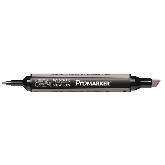 Promarker twin-tip. Professional twin-tip marker. Tusj med to ulike spisser - til detaljarbeider og til fargelegging. Permanent. Egnet til alle områder innen kunst, design og hobby. De brukes like gjerne av arkitekter, serietegnere og mange illustratører som av nybegynnere. De er også meget gode til scrapbooking og til stempelmotiver. En utmerket egenskap er at fargeleggingen blir helt jevn også på store flater. En annen egenskap er at de er transparente, noe som betyr at to farger sammen kan gi en ny farge. Husk å farge over med den andre før den første har tørket. Vil man ha lysere farger, bruker man Promarker Blender. Warm Grey 2