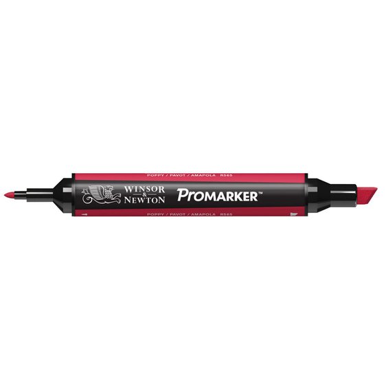 Promarker twin-tip. Professional twin-tip marker. Tusj med to ulike spisser - til detaljarbeider og til fargelegging. Permanent. Egnet til alle områder innen kunst, design og hobby. De brukes like gjerne av arkitekter, serietegnere og mange illustratører som av nybegynnere. De er også meget gode til scrapbooking og til stempelmotiver. En utmerket egenskap er at fargeleggingen blir helt jevn også på store flater. En annen egenskap er at de er transparente, noe som betyr at to farger sammen kan gi en ny farge. Husk å farge over med den andre før den første har tørket. Vil man ha lysere farger, bruker man Promarker Blender. Poppy