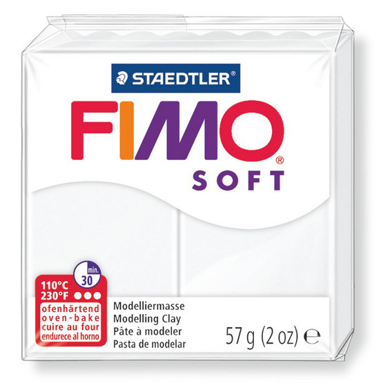 Fimo Soft, en meget myk og smidig leire som er lett å arbeide med og den kan lett blandes med Fimo effect. Leiren er garantert uten ftalater (kjemisk mykgjører). Det finnes uendelig mange ting å lage med Fimo, f.eks. smykker, miniatyrer, figurer til kjøleskapsmagneter m.m. Fimo herdes i ovn ved 110°C i 10-30 minutter (grader og tid må ikke overskrides og mikrobølgeovn må ikke brukes). Leiren er formstabil under herdingen, d.v.s. detaljer flyter ikke sammen. Beskytt gjerne bordet med plast og vask hendene etter bruk. Pakke med 57 g. White.