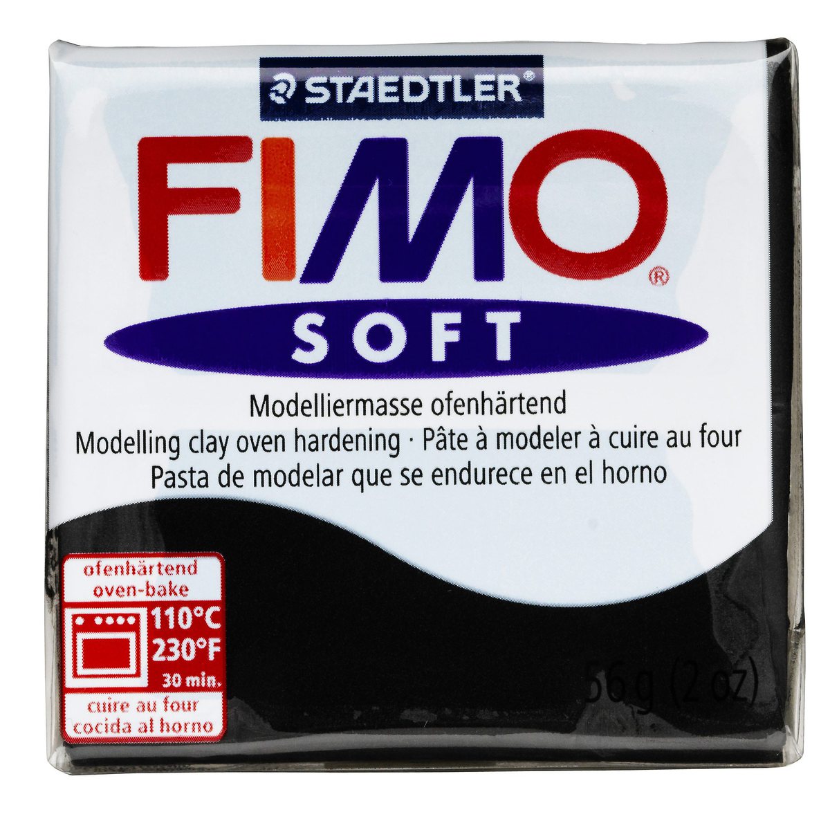 Fimo Soft, en meget myk og smidig leire som er lett å arbeide med og den kan lett blandes med Fimo effect. Leiren er garantert uten ftalater (kjemisk mykgjører). Det finnes uendelig mange ting å lage med Fimo, f.eks. smykker, miniatyrer, figurer til kjøleskapsmagneter m.m. Fimo herdes i ovn ved 110°C i 10-30 minutter (grader og tid må ikke overskrides og mikrobølgeovn må ikke brukes). Leiren er formstabil under herdingen, d.v.s. detaljer flyter ikke sammen. Beskytt gjerne bordet med plast og vask hendene etter bruk. Pakke med 57 g. Black.