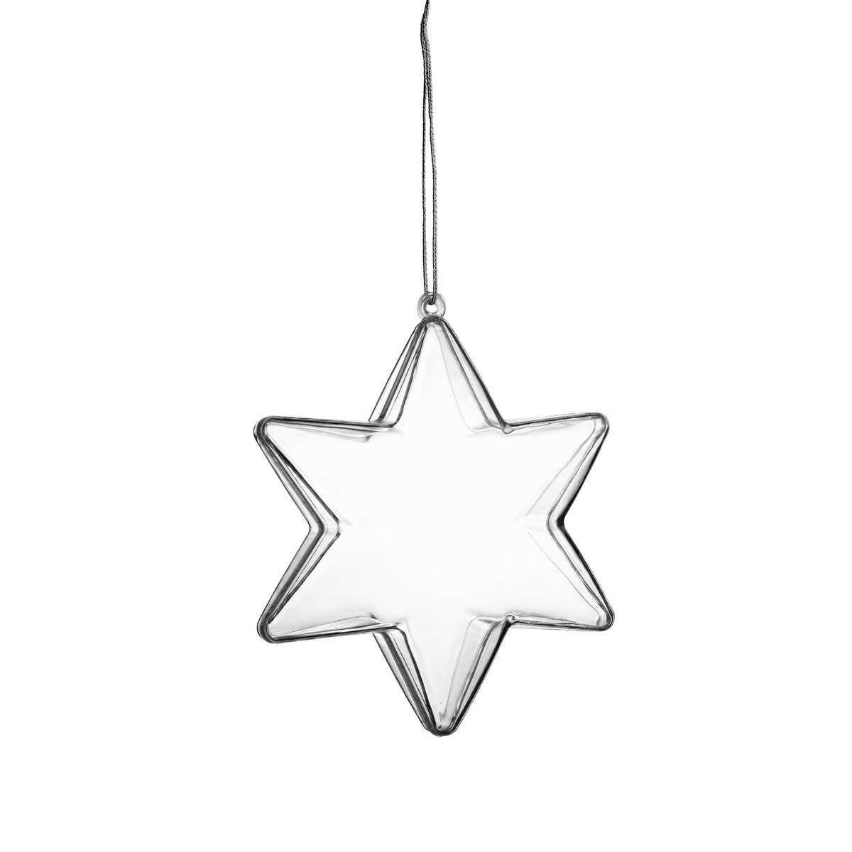 Delbar juletrepynt med skillevegg, av klar akryl. Pris pr. stk. Stjerne Ø 10 cm Tykkelse 44 mm