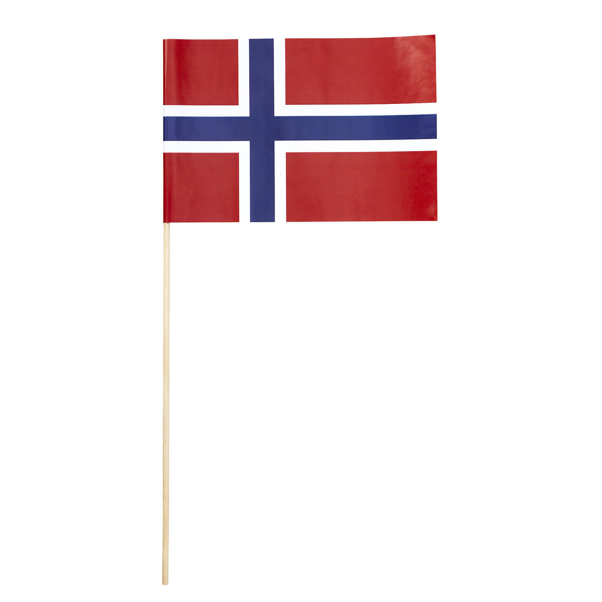 Flagg, av papir på trepinne 18,5x26 cm, høyde 50 cm. Skal du på student- eller russefest, fotballkamp, skirenn, Eurovision Song Contest eller noe annet festlig som behøver et heiende publikum? Da skal du jo selvfølgelig ha flagg å vifte med. Pakke med 3 stk. Norsk flagg