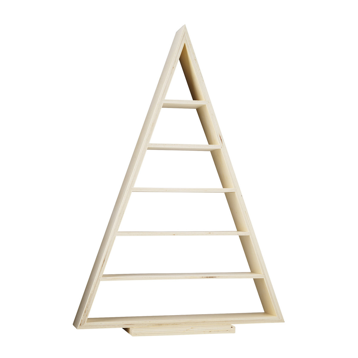Juletreformet hylle, av tre, 35x50 cm, dybde 6 cm. Seks hyller med ca. 6,5 cm mellomrom.