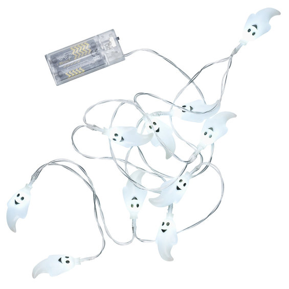 LED lysslynge Halloween, lysslynge med LED belysning, fin dekor til Halloween eller andre skumle anledninger. 10 lys, lengde 160 cm. Batteridrevet, 2 stk AA 1,5V (ikke med). Spøkelse, H. 5 cm.