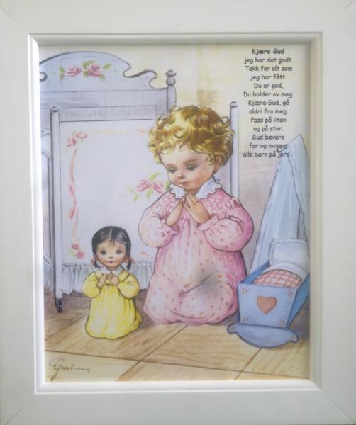 Koselig biide av pike som ber Aftenbønn, ferdig innrammet i hvit ramme. En meget populær gave fra beseforeldre til barnebarn. Bilde kan både henges på vegg eller stå på kommode/nattbord.