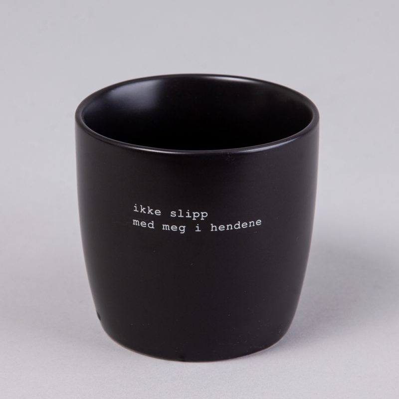 Sort krus med hank og tekst.