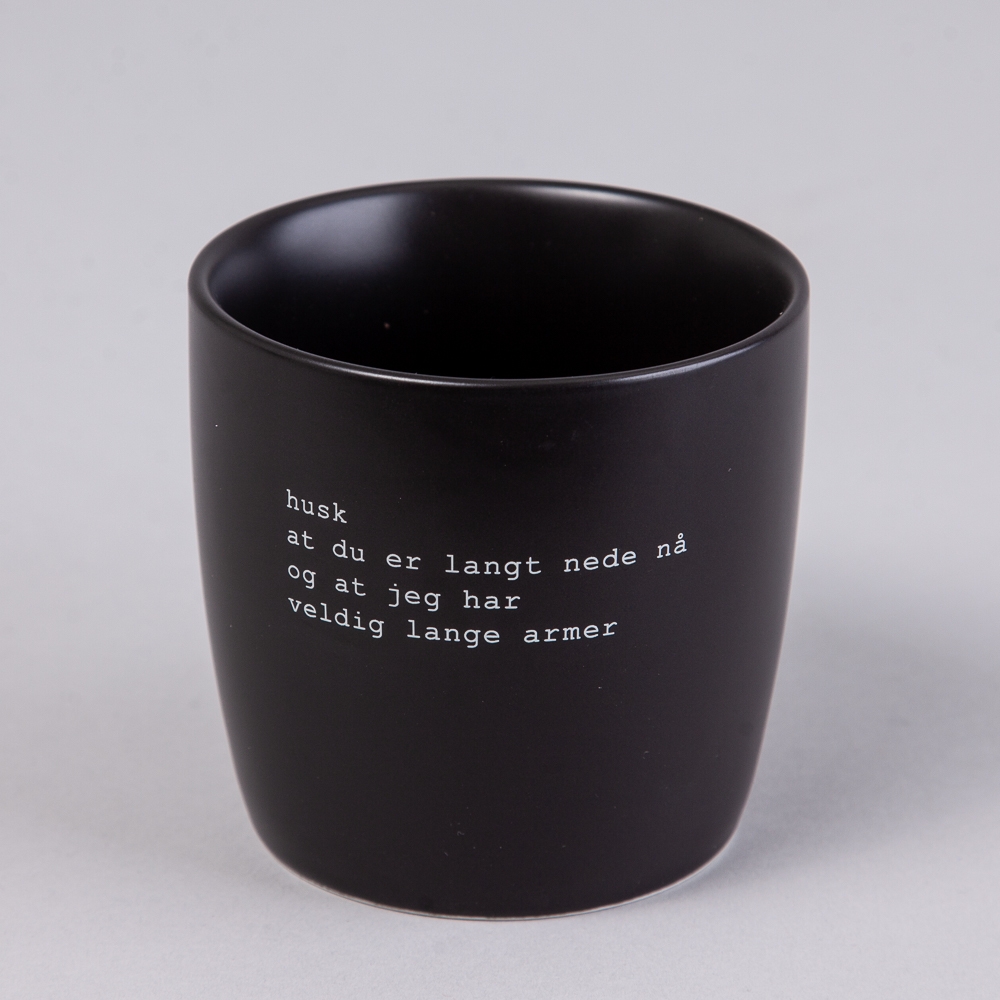 Sort krus med hank og tekst.