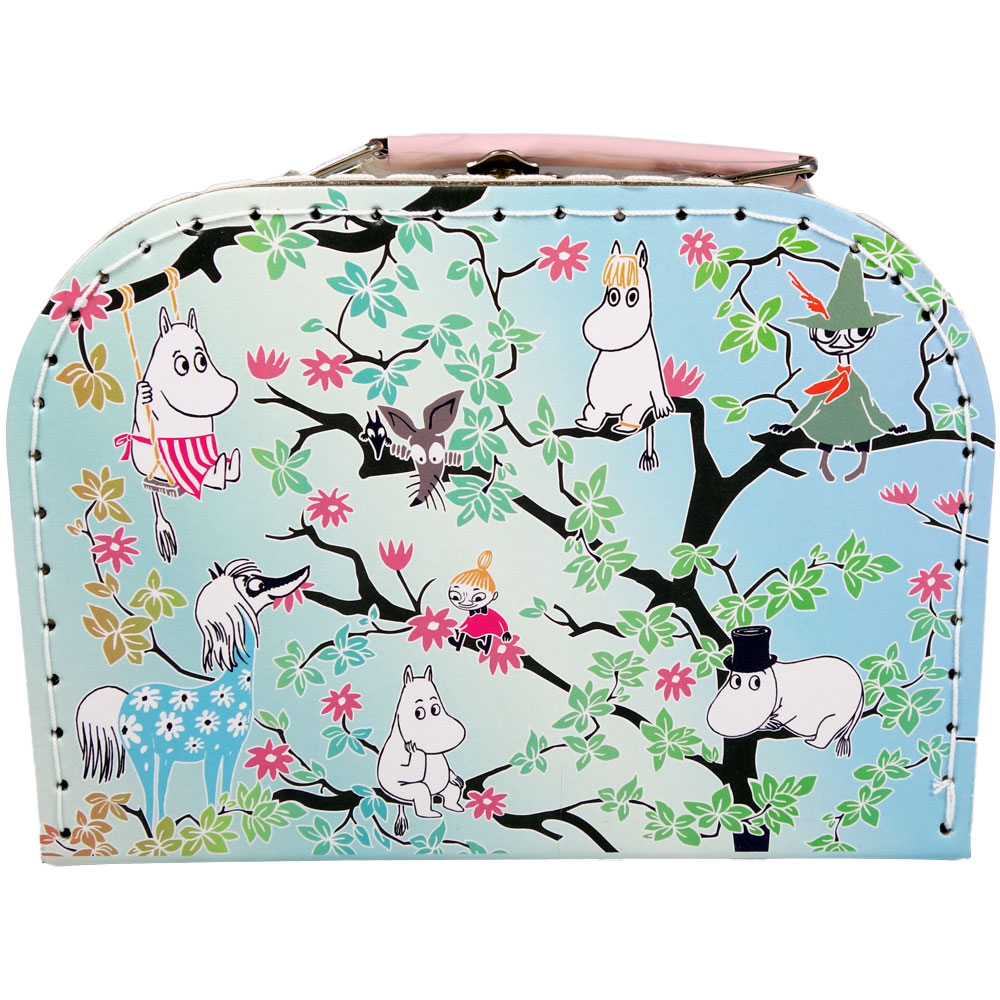 Fin, liten pappkoffert i hvitt og rosa med hvitt håndtak, lås i metall og koselig motiv av Mummi-vennene på hagefest. Innsiden er hvit og grønn med små, rosa epler. På innsiden av lokket er det trykt et hvitt felt der den lille eieren kan skrive navnet sitt.