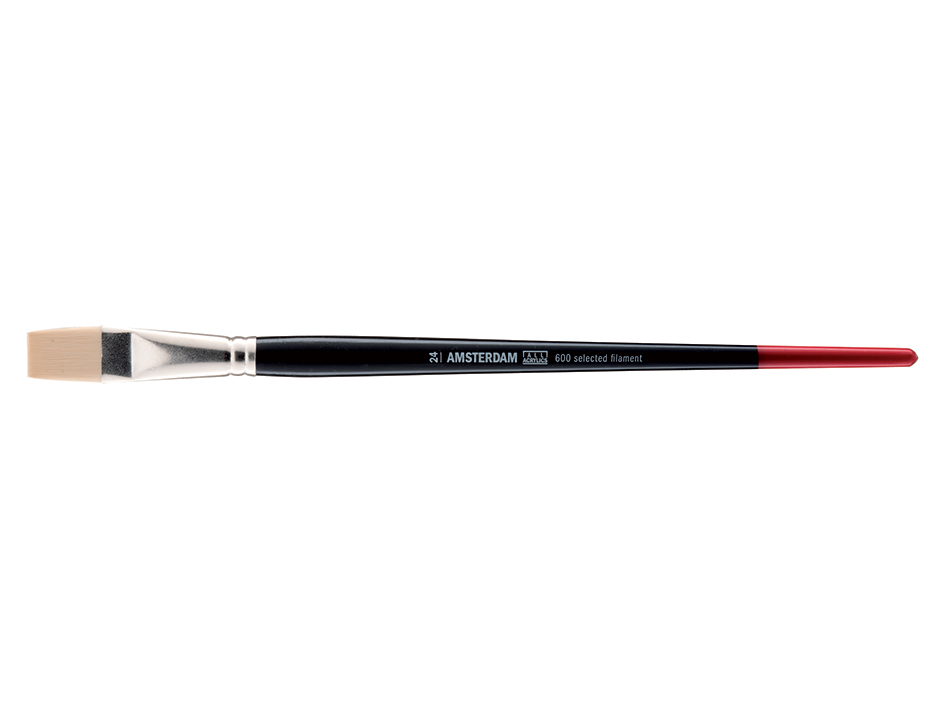 Flat pensel til litt tykk maling. Syntetisk, sterk og spenstig bust spesielt egnet for akrylmaling. Langt, sortlakkert skaft med rød tupp.