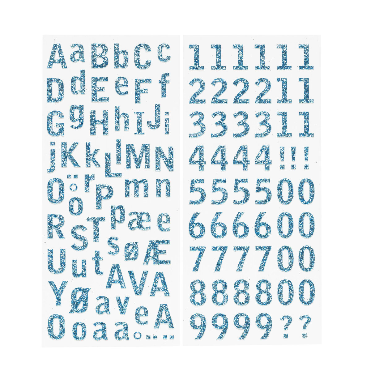 Stickers alfabet/tall, av papir med glitter (A–Å skandinavisk), høyde: A=14 mm. Syre- og ligninfritt. 4 ark 7,5x17 cm, 232 stk. Blå