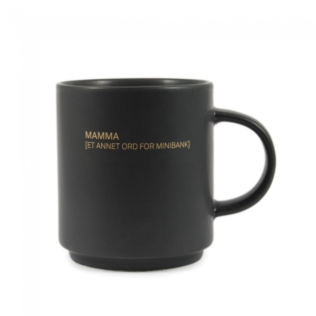 Kopp i keramikk med matt overflate og norsk tekst: "Mamma Et annet ord for minibank"