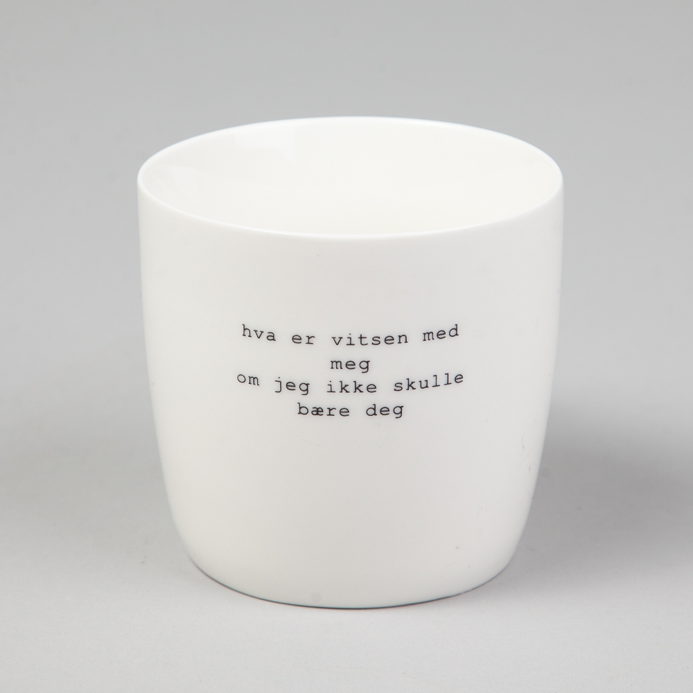 Bestselger! Nydelige porselenskrus med tekster av Trygve Skaug. Tåler oppvaskmaskin. Mål H 9cm, Ø 9cm.
