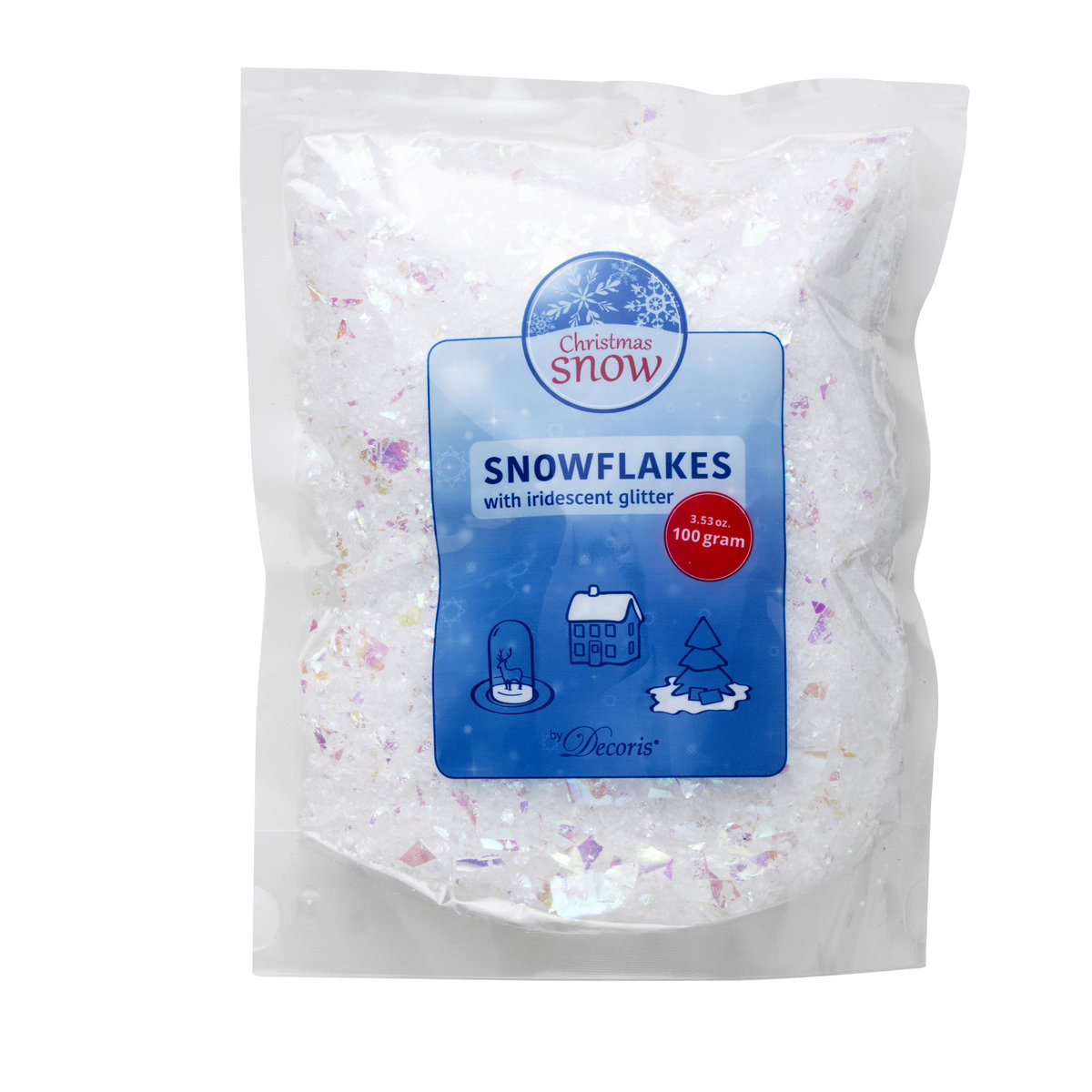 Christmas Snow, hvit kunstig snø av plast. Ja, se det snør! Og hvis det ikke gjør det, men du likevel vil ha en hvit jul, har vi løsningen her. Dessuten smelter den ikke hvis man vil ha det julefint innendørs! Dekorasjonssnø/kunstsnø til julekuler, nissedører, juleoppsatser, miniatyrlandskap og andre julearrangementer. Overflødig snø bør støvsuges opp. Snøen består av plast som er laget av polyetylentereftalat (PE) / PVC. OBS! Områder som småbarn, husdyr eller ild kan nå, skal ikke dekoreres med dette produktet. Barn og dyr kan ta feil av produktet og snø/salt – og det tørkede produktet er pulverisert plast som lett begynner å smelte. Snowflakes; 100 g. - Med iriserende glitter.