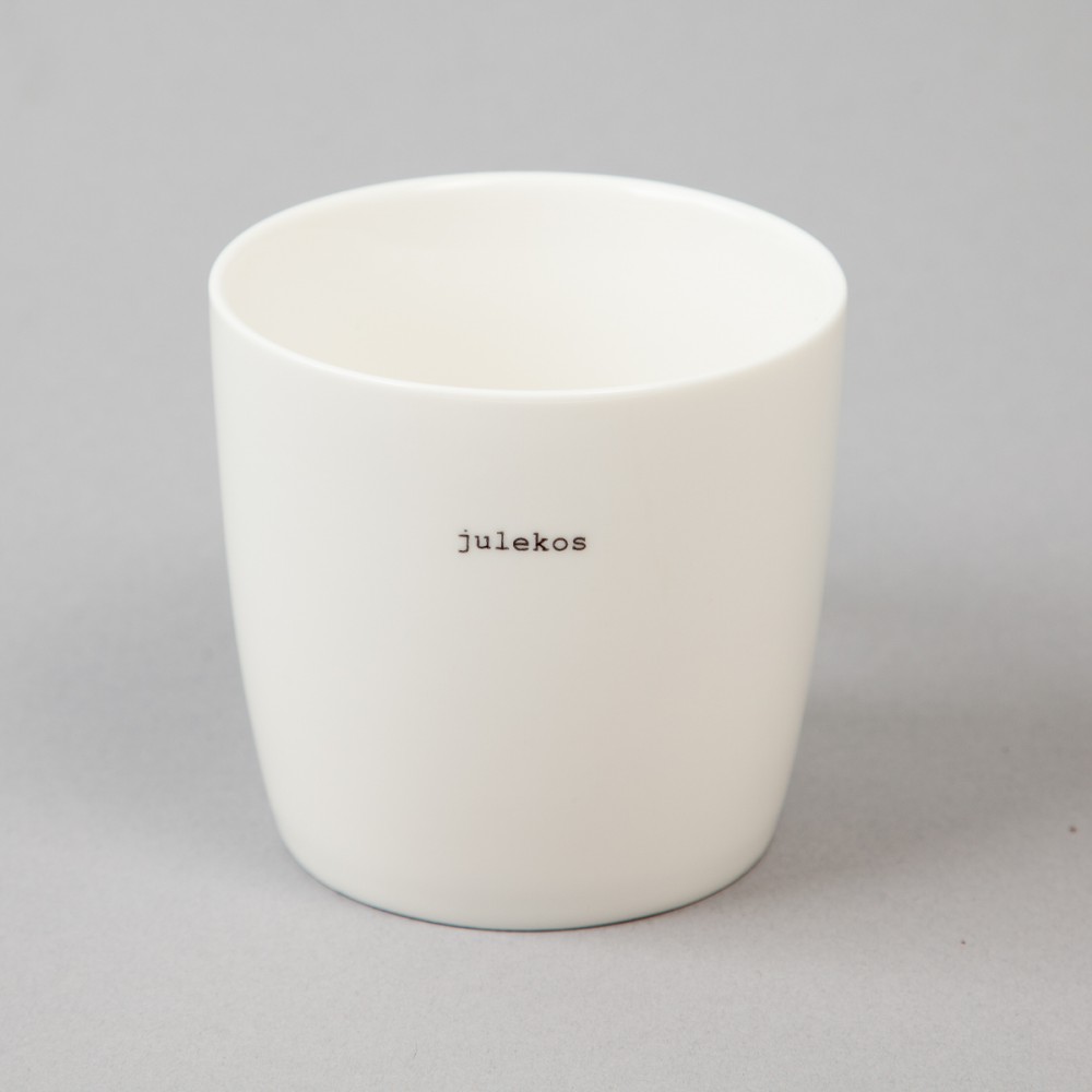 Porselens krus hvit med hank og sort tekst.