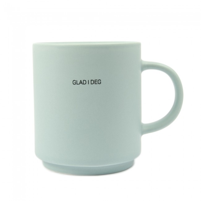 Kopp i keramikk med matt overflate og norsk tekst. "Glad i deg"