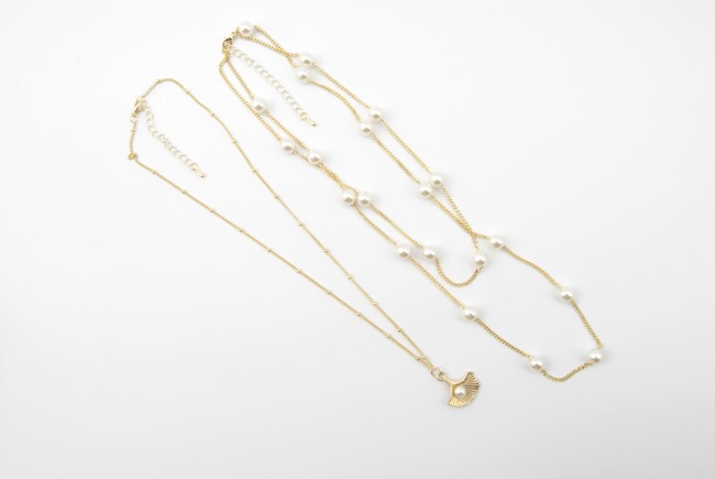 Smykke i gullfarge med perler og anheng.