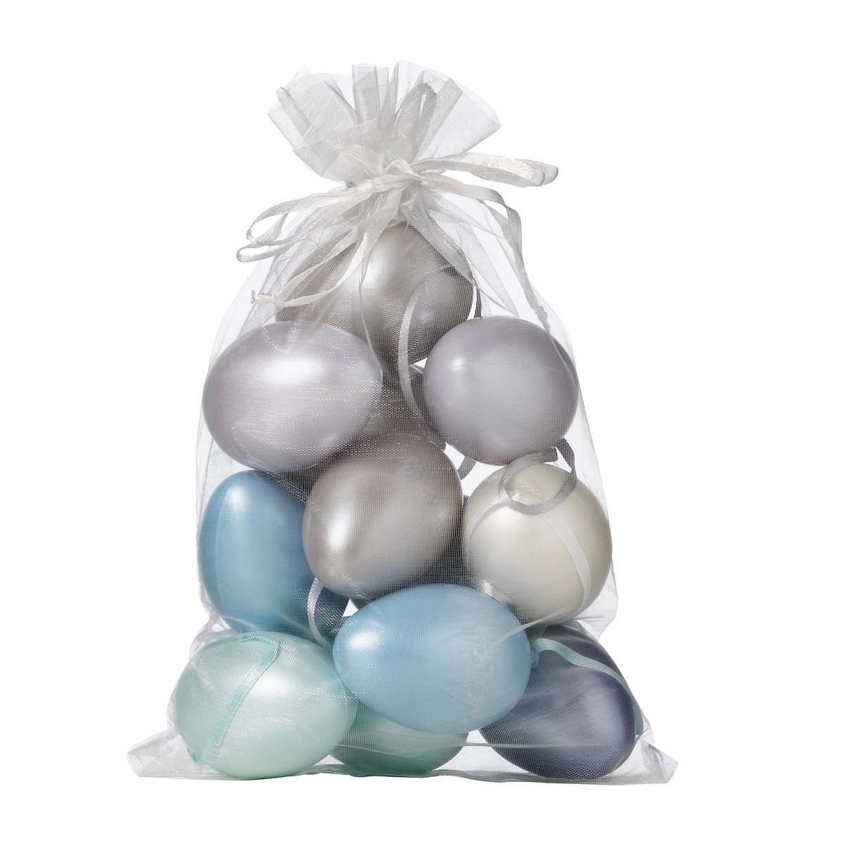 Plastegg i forskjellige størrelser og farger, en sikker og godt dokumentert måte å pynte til påske på! Plasser dem i påskeriset eller legg dem på bordet, de tar seg godt ut alle steder. Hvis ikke annet er angitt, er eggene laget av plast og utstyrt med opphengssnor. Fine som de er, men med noen kreative innslag i form av hobbylakk, decoupage, dekorsteiner og glitterlim blir de enda mer unike og flotte. 12 stk. i diverse blåfarger - 6 cm høye, 4 cm i diameter.